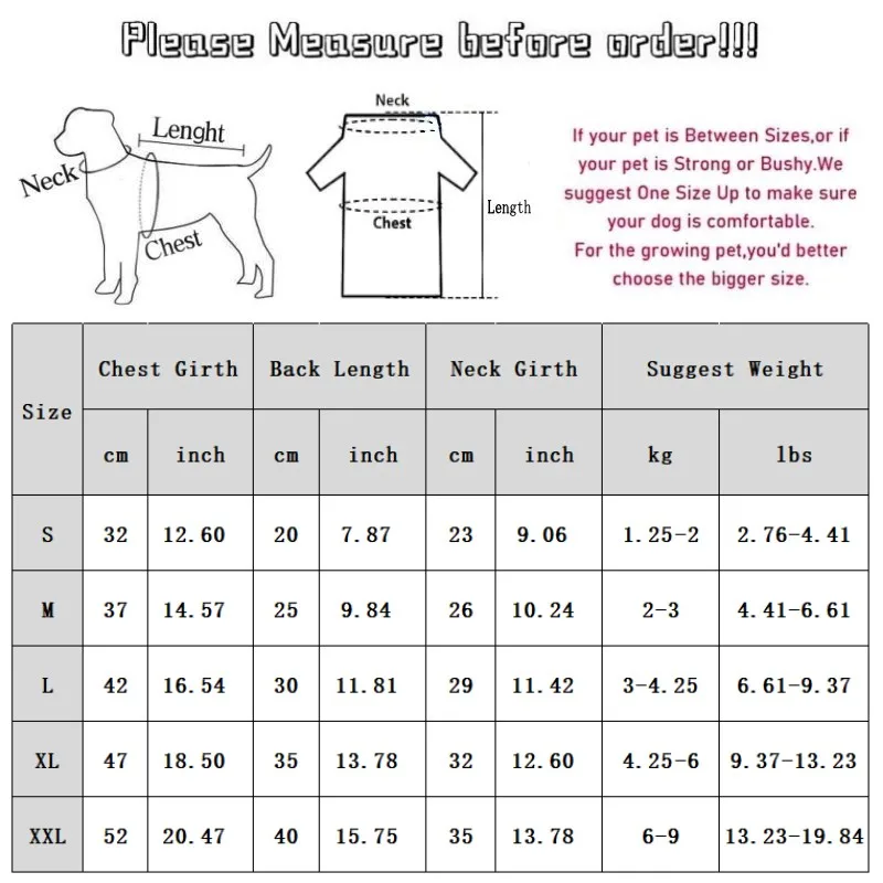XXL: Chest 52cm/20.47'' ; Length 40cm/15.75'' ; Neck 35cm/13.78'' ; Suggest Weight 6-9 kg/13.23-17.64 lbs.